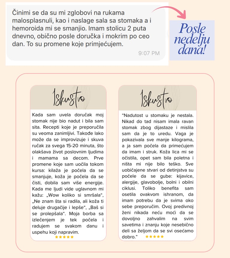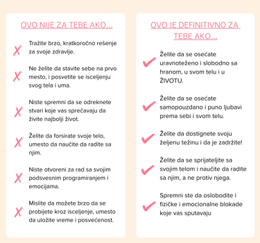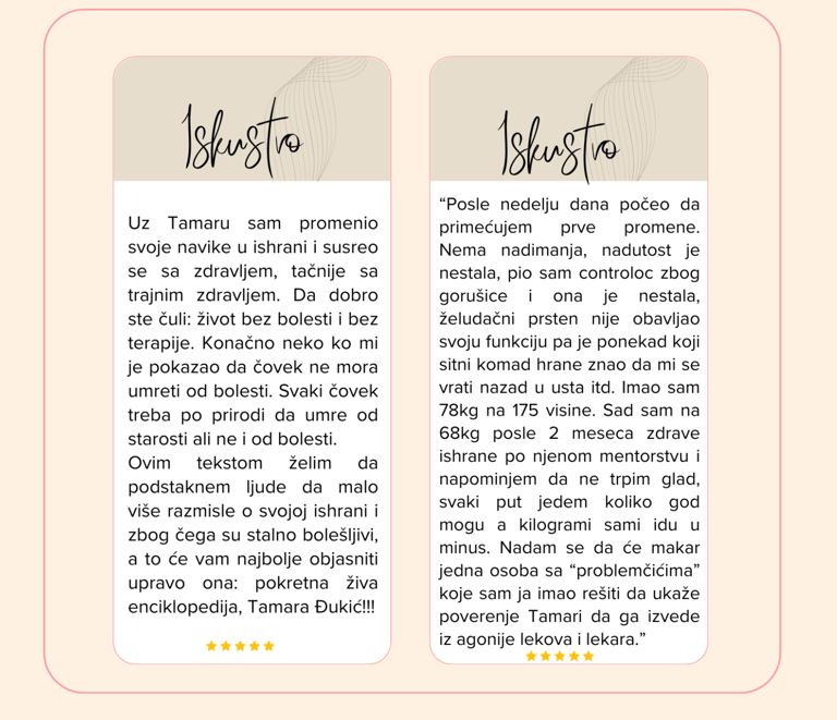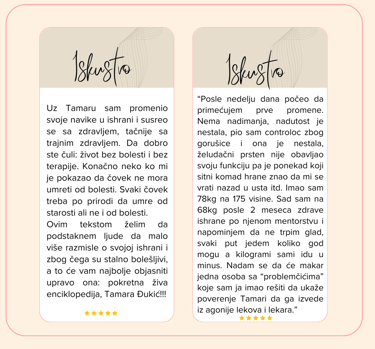 Tamara Đukić nije medicinski stručnjak i ne pruža zdravstvene, medicinske, nutricionističke, ili bilo koje druge terapijske usluge niti pokušava da dijagnostikuje, leči, izleči ili spreči bilo koje fizičke, mentalne ili emocionalne probleme. Informacije date u pisanom, video ili audio obliku, na veb stranici tamaradukic.com (uključujući tekstove, blogove, fotografije, snimke, programe, knjige i druge audio, video ili pisane materijale) ili na kursevima koje nudi Tamara Đukić, predstavljaju lični stav autora i date su samo u informativne svrhe i nisu namenjene da zamene profesionalni medicinski savet, dijagnozu ili lečenje. Uvek tražite savet od svog lekara ili drugog kvalifikovanog zdravstvenog radnika pre nego što preduzmete bilo kakve promene vezane za sopstveno zdravlje, ishranu ili vežbanje. Nemojte zanemariti medicinski savet ili odlagati da ga potražite zbog informacija koje ste dobili na kursu ili pročitali na veb stranici tamaradukic.com. Nemojte započinjati ili prekidati lekove bez prethodnog razgovora sa svojim lekarom ili zdravstvenim radnikom. Nemojte menjati svoju ishranu, vežbanje ili životne navike bez prethodnog razgovora sa vašim zdravstvenim radnikom ili lekarom. Polaznik kursa je u potpunosti odgovoran za svoje izbore, odluke i zdravstveno stanje pre, tokom i nakon pohađanja bilo kog kursa koji nudi Tamara Đukić. Pristankom da pohađa bilo koji kurs koji nudi Tamara Đukić, klijent prihvata odgovornost za svoje zdravstvene, nutricionističke i druge odluke koje se tiču načina života i oslobađa Tamaru Đukić bilo kakve moralne, materijalne ili zakonske odgovornosti.